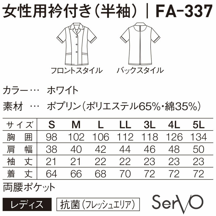 ■品名・品番 レディース半袖調理衣 FA337 ■カラー ホワイト ■サイズ S M L LL 3L 4L 5L サイズ表(仕上り寸法) メーカー基本ヌード寸法 ■素材 ポプリン/フレッシュエリア加工/ポリエステル65%+綿35% ■機能・特長 抗菌 ■仕様 両腰外ポケット ■着用シーズン オールシーズン ■同シリーズ レディース長袖調理衣 FA330 ■メーカー・ブランド Servo(サーヴォ) [旧]SUNPEX IST(サンペックスイスト) お届け情報 メーカーお取り寄せの商品です。